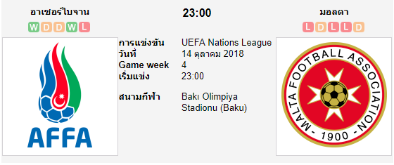 เจ้าบ้าน อาเซอร์ไบจาน ผลงาน 5 เกมหลังสุด ชนะ 2 เสมอ 2 แพ้ 1 ในส่วนของทีมเยือน มอลตา ผลงาน 5 เกมหลังสุด เสมอ 2 แพ้ 3 ในเกมนี้เล่นกันในบ้านของ อาเซอร์ไบจาน และ ผลงานของทีมเจ้าบ้าน อาเซอร์ไบจาน เองในช่วงที่ผ่านมานั้น ทำผลงานได้ไม่เลวเลยเหมือนกัน แม้ว่า 2 เกมแรกพวกเขาจะสะดุด เสมอรวด มาทั้ง 2 นัด แต่ในเกมนัดล่าสุดพวกเขาเองก็เพิ่งบุกไปเก็บ 3 แต้มมาได้จากทีมเต็ง 1 ของกลุ่ม น่าทำให้ ขุมกำลังของ อาเซอร์ไบจาน เองนั้น เพิ่มความมั่นใจขึ้นมาได้อีกเยอะ ขณะที่ทีมเยือน มอลตา ผลงานในช่วงที่ผ่านมานั้นก็ถือว่าพวกเขา ทำผลงานได้ตามทรงของทีม เต็งบ๊วยของกลุ่ม ลงเตะมาแล้ว 3 นัด มีอยู่เพียงแค่ 1 แต้ม เท่านั้น และ เกมนี้ มอลตา เองพวกเขาจะต้องบุกมาเจอกับทีมเต็ง 2 ของกลุ่ม ที่นัดล่าสุดเพิ่งบุกไปอัดทีมเต็ง 1 มาแบบชิลๆ และ แม้ว่า คู่นี้จะเจอกันมาก่อนแล้วในบ้านของ มอลตา และ เป็น มอลตา ที่ยันเสมอ ไว้ได้ แต่ เกมนี้พวกเขาต้องบุกมาเล่นในสถานะทีมเยือน มองว่าโอกาสที่จะบุกมา ยันเสมอได้นั้น น่าจะเป็นไปได้ค่อนข้างยากแน่นอน บวกกับ เจ้าบ้านเองก็น่าจะกำลังอยู่ในช่วงที่ ฟอร์มกำลังมั่นใจด้วย เกมนี้เชื่อว่าเจ้าบ้าน อาเซอร์ไบจาน น่าเก็บ 3 แต้ม และ ยิงเกินแรงต้านได้