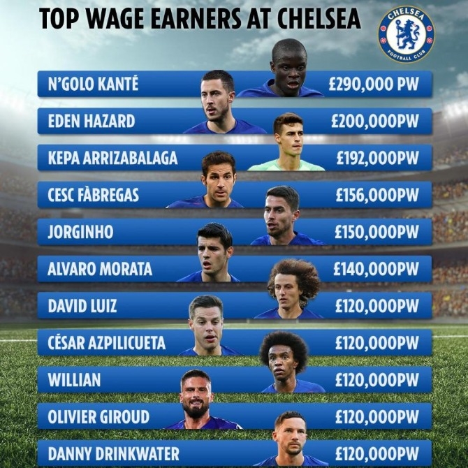ลำดับค่าเหนื่อยระดับต้นๆทีมเชลซี