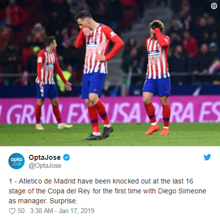 สำหรับการตกรอบ 16 ทีมสุดท้ายของ แอต.มาดริด ถือเป็นครั้งแรกนับตั้งแต่ ดีเอโก้ ซิเมโอเน่ เข้ารับตำแหน่งกุนซือเลย